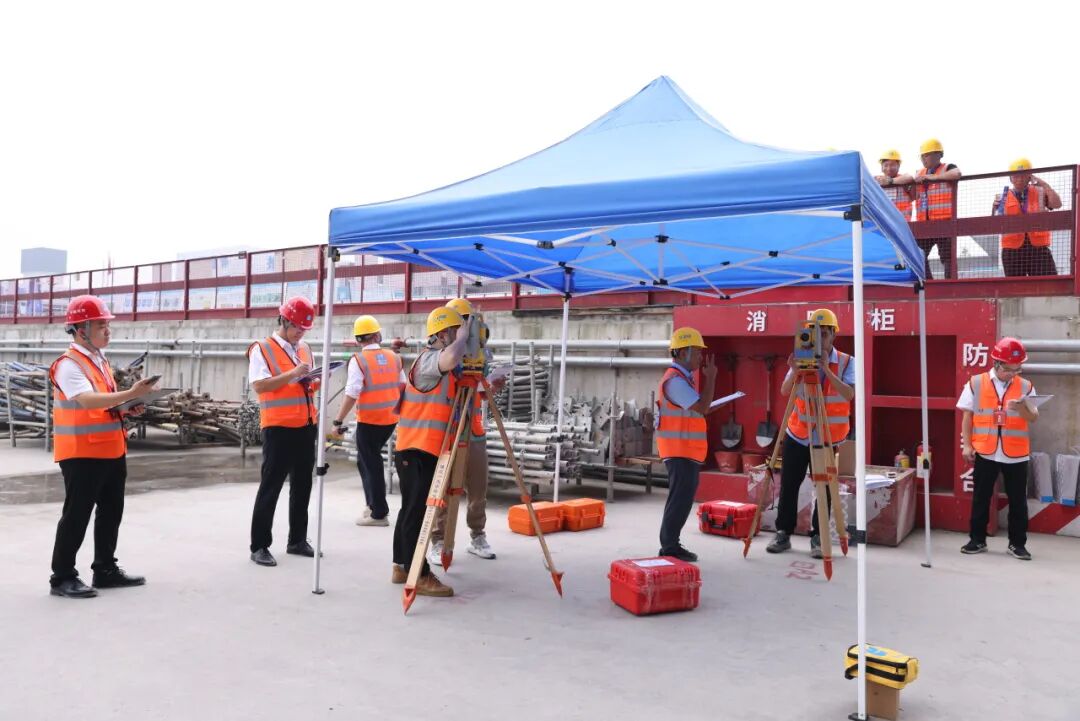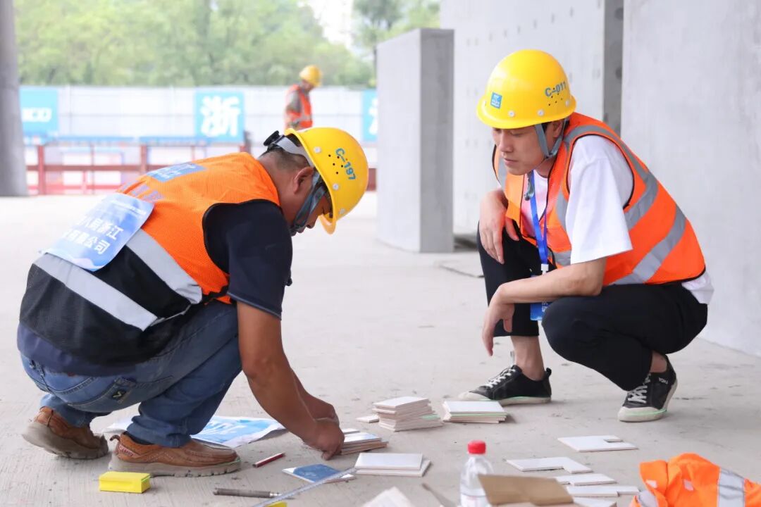 施工现场,瓷砖镶贴实操技能比武与导线测量实操比武在不同区域同时进行。按照参赛规则,瓷砖镶贴工需在6小时内完成规定的墙面图案,裁判员从评价分、测量分以及测评点三个方面进行综合评分;测量实操选手需使用全站仪、棱镜进行一级导线实际操作,测量结束后计算个人总分及团队得分。