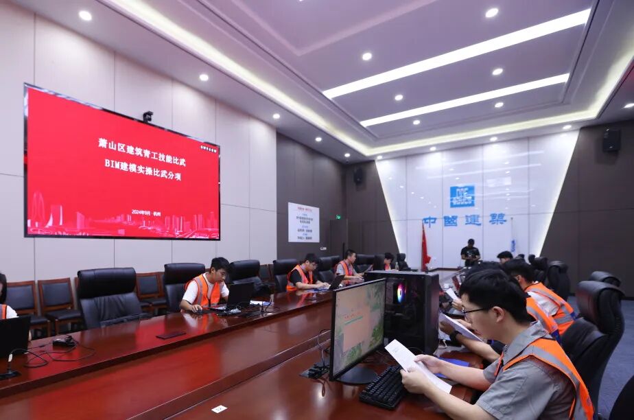 会议室中,BIM建模比赛也在同步进行中,参赛选手需在3个小时内完成土建建模、机电建模及应用成果输出,裁判员依据成果文件准确性、完整性进行综合评分。